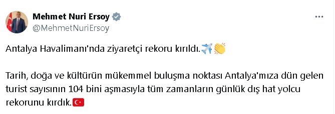 Ulaştırma ve Altyapı Bakanı Abdulkadir Uraloğlu, 3 Ağustos'ta Antalya Havalimanı'nda 1217 uçak trafiği ve 223 bin 217 yolcu ile tüm zamanların hem uçak trafiği hem de yolcu sayısı rekorunun kırıldığını duyurdu.Ulaştırma ve Altyapı Bakanı Abdulkadir Uraloğlu, 3 Ağustos 2024 Cumartesi günü Antalya Havalimanı'nda, dış hatlarda 1087, iç hatlarda 130 uçuş trafiği olmak üzere toplamda 1217 uçak trafiğine hizmet verildiğini belirterek, "Bir günde havalimanımızı 203 bin 304 dış hat yolcusu, 19 bin 913 iç hat yolcusu olmak üzere toplam 223 bin 217 yolcu kullandı. Böylece Antalya Havalimanı hem uçak trafiğinde hem de yolcu sayısında tüm zamanların rekorunu kırdı" dedi. BAKAN ERSOY: 104 BİN TURİST İLE DIŞ HAT YOLCU REKORUNU KIRDIK Kültür ve Turizm Bakanı Mehmet Nuri Ersoy da konuyla ilgili yaptığı yazılı açıklamada, "Tarih, doğa ve kültürün mükemmel buluşma noktası Antalya'mıza dün gelen turist sayısının 104 bini aşmasıyla tüm zamanların günlük dış hat yolcu rekorunu kırdık. Yalnızca muhteşem plajlarıyla değil, aynı zamanda zengin tarihi, büyüleyici doğal güzellikleri ve eşsiz kültürel mirasıyla da turistlerin gözdesi olan Antalya'da, ağustos ayının ilk 3 gününde ise yaklaşık 280 bin turist ağırladık. Geçen yılın aynı dönemine göre yüzde 10 artış gösteren bu muhteşem başarıda emeği geçen herkese teşekkür ediyorum. Ağustos ayının ilk üç gününde Antalya'ya uçakla gelen turist sayısı 278 bin 854 olurken, 2024 yılı toplamında bu rakam 9 milyon 290 bin 308'e ulaştı. Bu veriler, 2023 yılının aynı dönemine göre yüzde 10'luk bir artışa işaret ediyor. Geçen yıl 3 Ağustos tarihinde 88 bin 250 dış hat yolcusu gelmişti. Ayrıca, 3 Ağustos günü Antalya Havalimanı'nda 1217 uçak iniş ve kalkış yaptı. Bu yoğunluk, Antalya'nın turizmdeki önemini bir kez daha gözler önüne serdi" dedi.