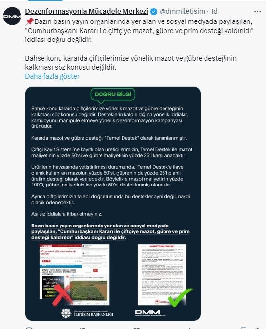 Bazı basın yayın organlarında "Cumhurbaşkanı Kararı ile çiftçiye mazot, gübre ve prim desteği kaldırıldığı" iddia edilmişti. Dezenformasyonla Mücadele Merkezi, tarımsal destek ödemelerine ilişkin haberleri yaptığı paylaşımla yalanladı.