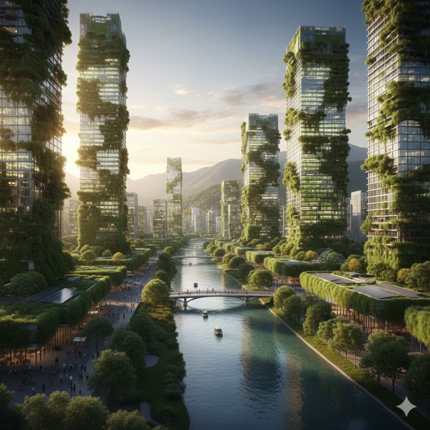 (Görsel: Yeşil binalar, dikey tarım yapılan gökdelenler, temiz nehirler)