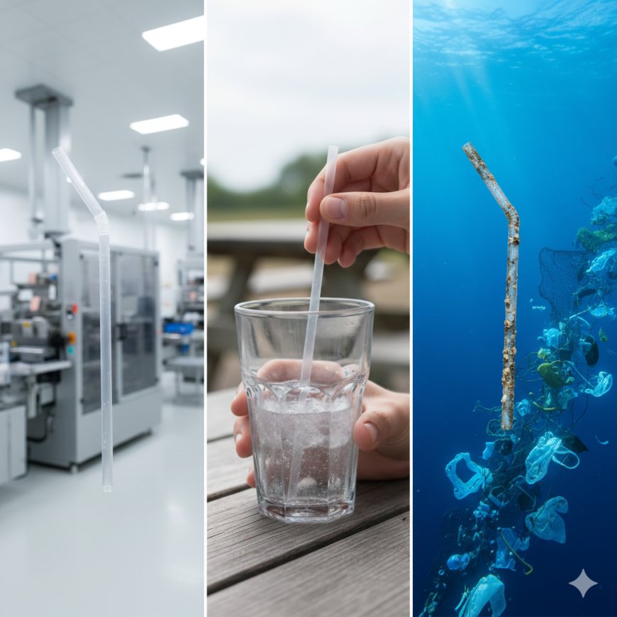(Görsel: Bir plastik pipetin üretimi, 5 dakika kullanımı ve yüzyıllarca denizde yüzmesi)