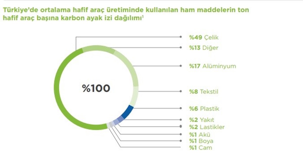 OSD raporuna göre “elektrikli araçların kullanımı ve bu sayede sağlanacak düşük emisyon hedefleri ancak şebekelerdeki elektriğin karbonsuzlaşma hedefleri ve stratejileri ile mümkün hale gelebilecek.” OSD ayrıca elektrikli araçlardaki menzil değerlerinin bataryaların şarj kapasitelerine ve motorun çektiği akıma bağlı olduğuna işaret ederek enerji depolama maliyetlerinin henüz fosil yakıt motorlu araçların seviyelerine düşmediğine dikkat çekiyor. ARAÇ BAŞINA EMİSYON OSD raporuna göre otomotiv ana sanayi tesislerinde araç üretimi kaynaklı iklim değişikliği etkisinin yaklaşık yüzde 1-5’lik kısma karşılık geldiği tahmin ediliyor. Ayrıca yaşam sonu ürün bertarafı kaynaklı karbon ayak izi ise toplam araç emisyonunun yüzde 5’ine denk düşüyor. OSD üyelerinden alınan veriler doğrultusunda ton ağırlık başına hafif araçlar için karbon ayak izi değeri 4 bin 669 kg CO2 olarak bulunmuş. OSD üreticilerinin hafif araçların ortalama ağırlığı 1,2 ton olduğu düşünülürse, bir adet hafif araç için fabrika çıkışı ve dağıtım dahil karbon ayak izi 5 bin 603 kg CO2. Diğer taraftan üretimde kullanılan malzemeler toplam emisyonun yüzde 88,6 gibi büyük bir kısmını oluşturuyor. Raporlar, araç üretiminde kullanılan malzemeler kaynaklı karbon ayak izi değeri ton hafif araç başına 4 bin 136 kg CO2 olarak hesaplanmış. Bu emisyonda araç başına karbon ayak izi hammadde bazında değerlendirildiğinde çelik ürünlerinin en fazla paya sahip. Türkiye’de üretilen hafif araçların üretim öncesi lojistiği payı ise yüzde 2,7, üretim sonrası lojistiği de yüzde 1,5 olarak hesaplanmış.