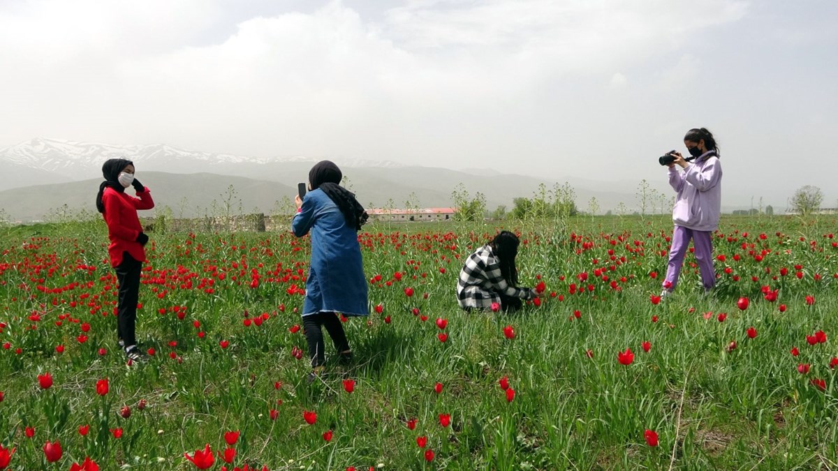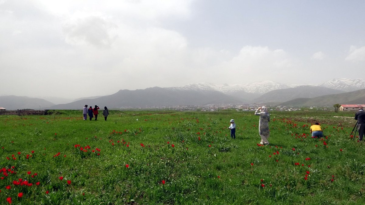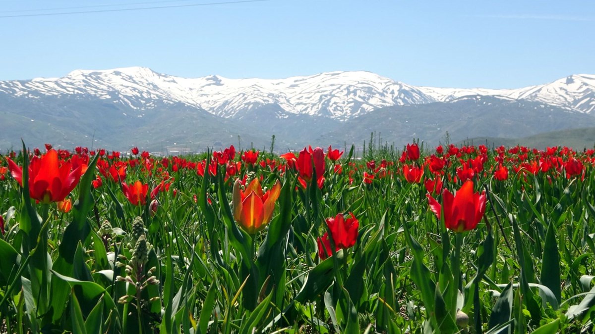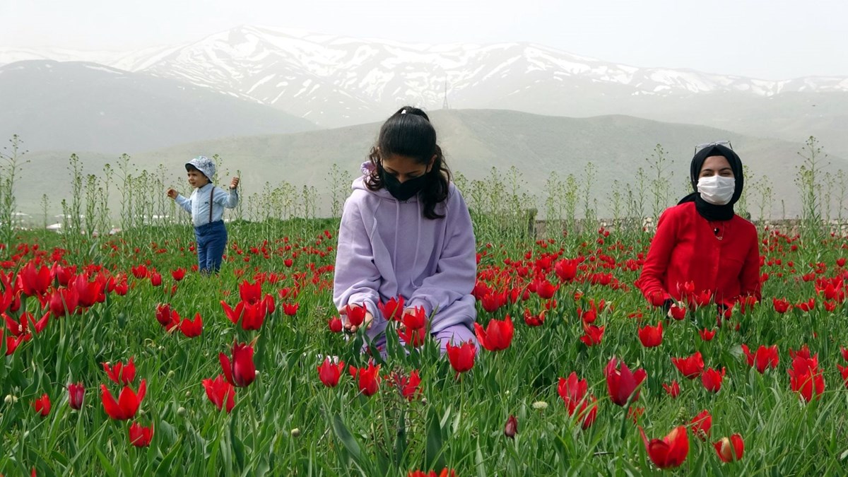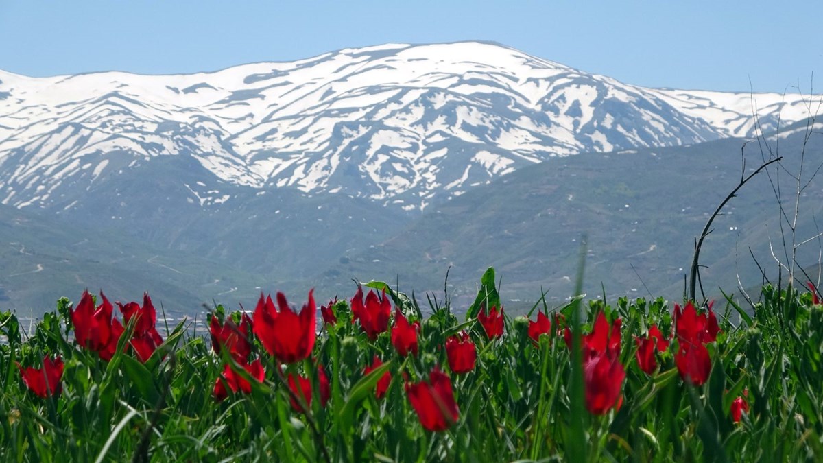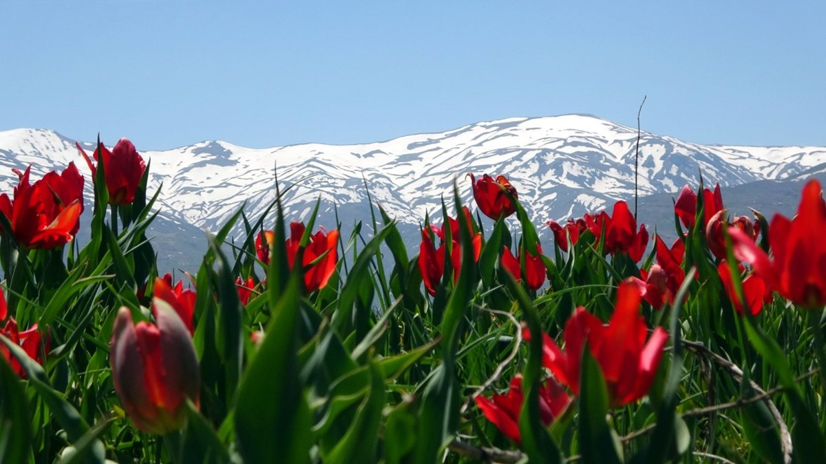Muş Ovası’nda doğal olarak yetişen ve endemik bitki türleri arasında yer alan Muş Lalesi'nin karlı dağlarla birleşen görüntüleri kartpostallık oluşturuyor.