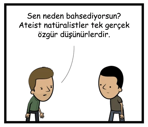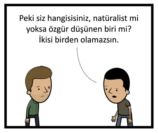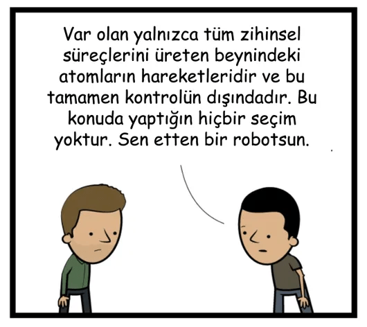 Sağdaki adam (ona “Bill” diyelim) Phil’in görüşünde bir sorun olduğunu fark ediyor. Eğer güçlü natüralizm doğruysa, bu insanlıkla ilgili her şeyin (hiçbiri bizim kontrolümüzde olmayan) doğa yasaları ve olayları tarafından belirleneceği anlamına gelir. Eğer bu akıldan yoksun ön koşullar Phil’in zihinsel faaliyetlerinin tamamına neden oluyor ve belirliyorsa, o zaman düşüncelerinin ve inançlarının hiçbiri özgür ya da Phil’in kontrolü altında değildir.