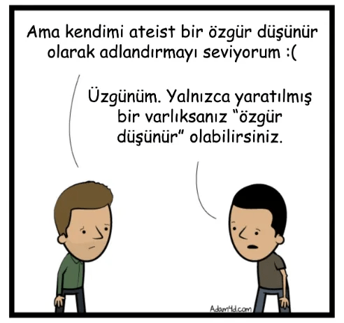 Neyse ki, arada bir bu felsefi meseleleri anlayan bir kişi, bu büyük fikirleri herkesin (küçük çocuklar dahil) kavrayabileceği şekilde kitlelere nasıl ileteceğini bilebilme gibi nadir bir yeteneğe de sahip oluyor. The Babylon Bee’nin ilk kurucusu Adam Ford bu parlak beyinlerden biridir. O, sadece Özgür Düşünme Argümanının arkasındaki büyük fikirleri kavramış gibi görünmekle kalmaz, aynı zamanda bu büyük fikirleri kısa bir çizgi romanla nasıl ileteceğini de bilmektedir. Phil ve Bill arasındaki aşağıdaki konuşmayı düşünün.